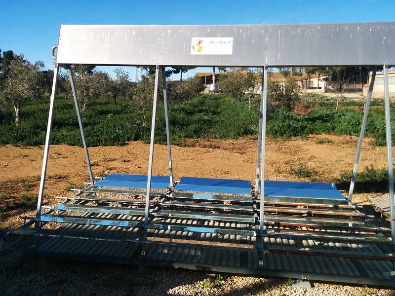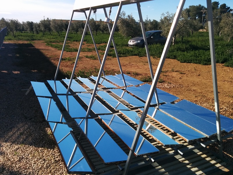 Tecnología: Sistema de Concentración Solar FRESNEL Aplicaciones: Producción de agua caliente, agua sobrecalentada, vapor industrial Temperaturas de salida: Configurable a la salida hasta 300ºC Aporte térmico externo: NO Descripción de la aplicación: Sistema de producción energética en forma de agua caliente con un máximo de temperatura para aplicación de 100ºC, que sirve como apoyo térmico a un depósito de inercia. Este diseño novedoso y a pequeña escala ha sido desarrollado para ser instalado en cubiertas de edificios. |